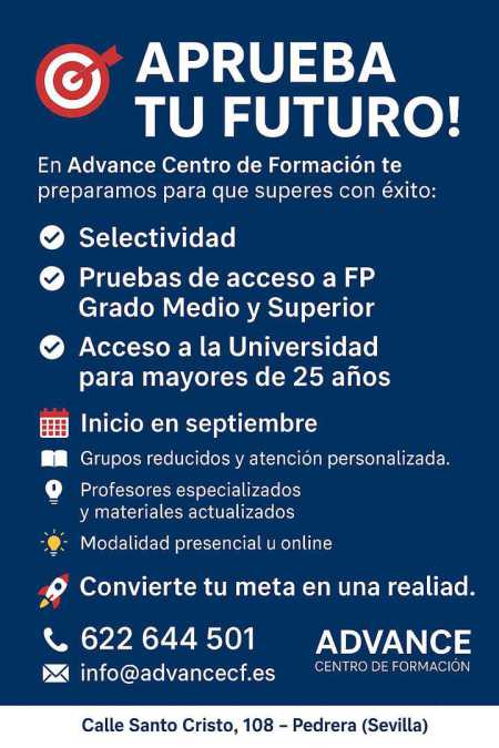 - Lugar: Advance Centro de Formación – C/ Santo Cristo, 108. Pedrera (Sevilla)